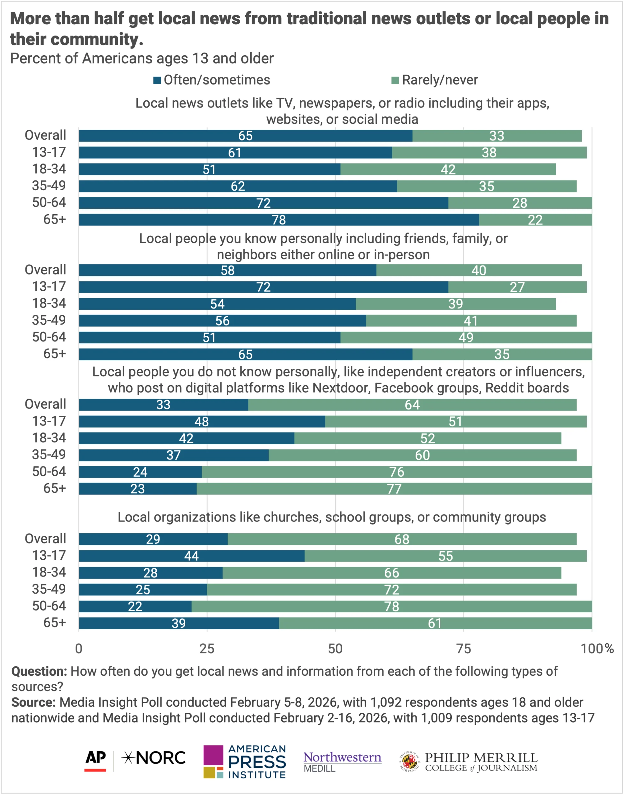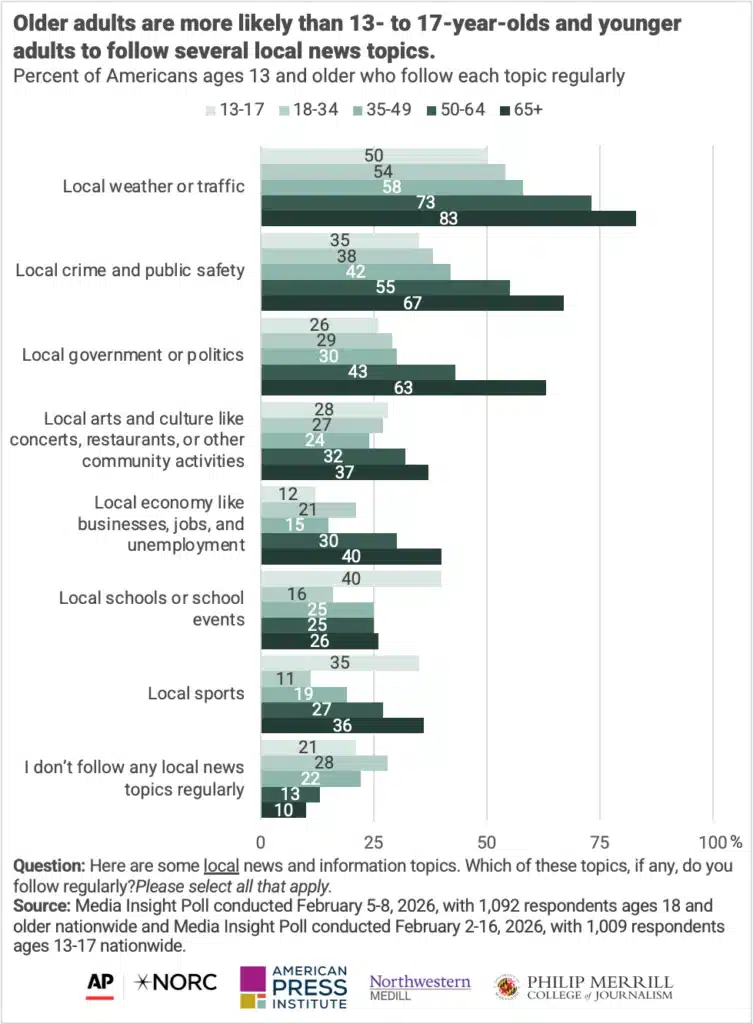 Adults over 65 are more likely than those ages 49 and younger to use local news outlets like television or radio. Alternatively, those 13-17 are more likely than older adults to get local news from local influencers or creators, indicating that reliance on local news influencers decreases with age.