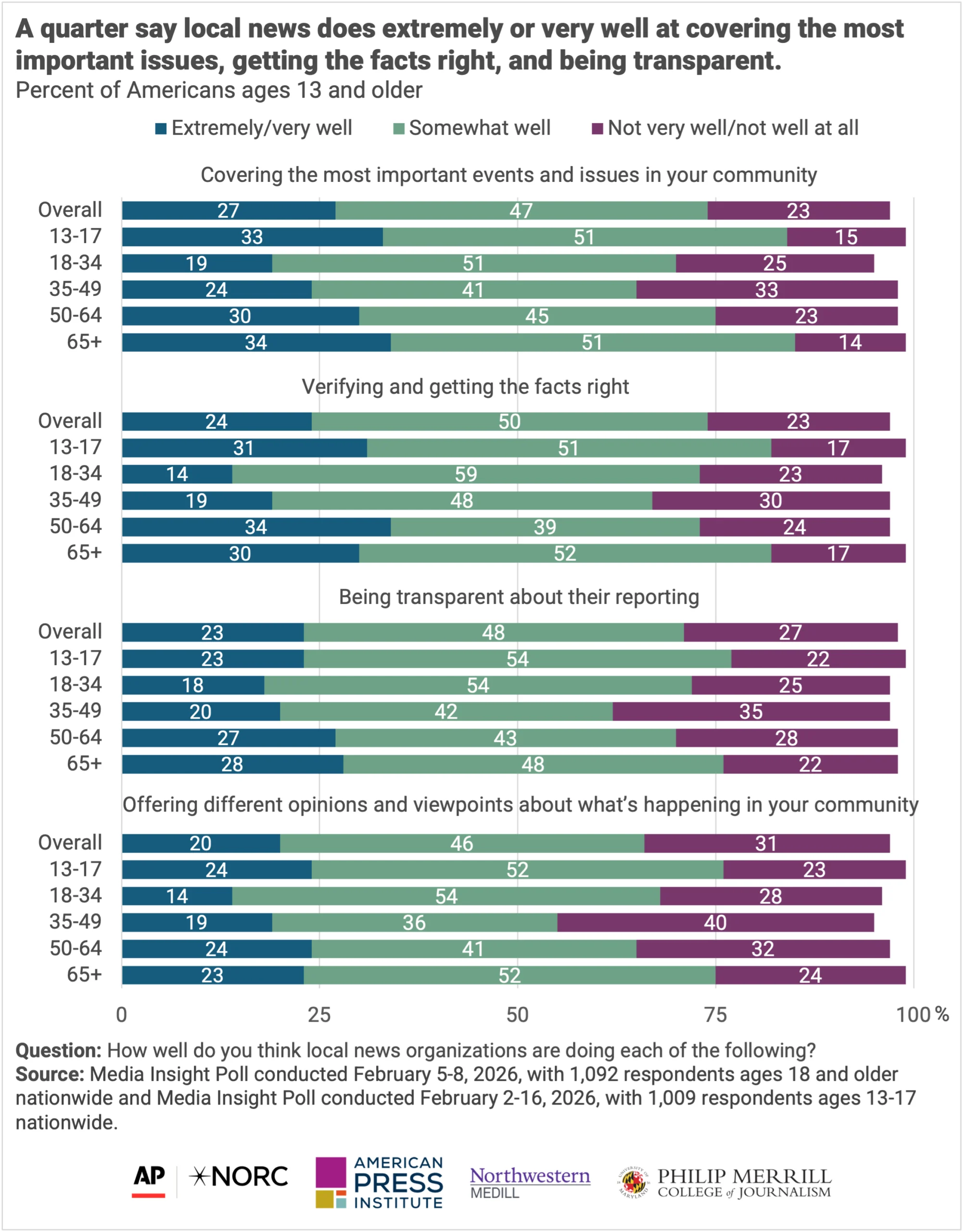 Local news organizations are seen in a mostly positive light. Most teens and adults say local news organizations are doing at least somewhat well at verifying and getting facts right, covering the most important events and issues, being transparent, and offering different opinions and viewpoints, with about a quarter saying they are doing extremely or very well at all of these things.