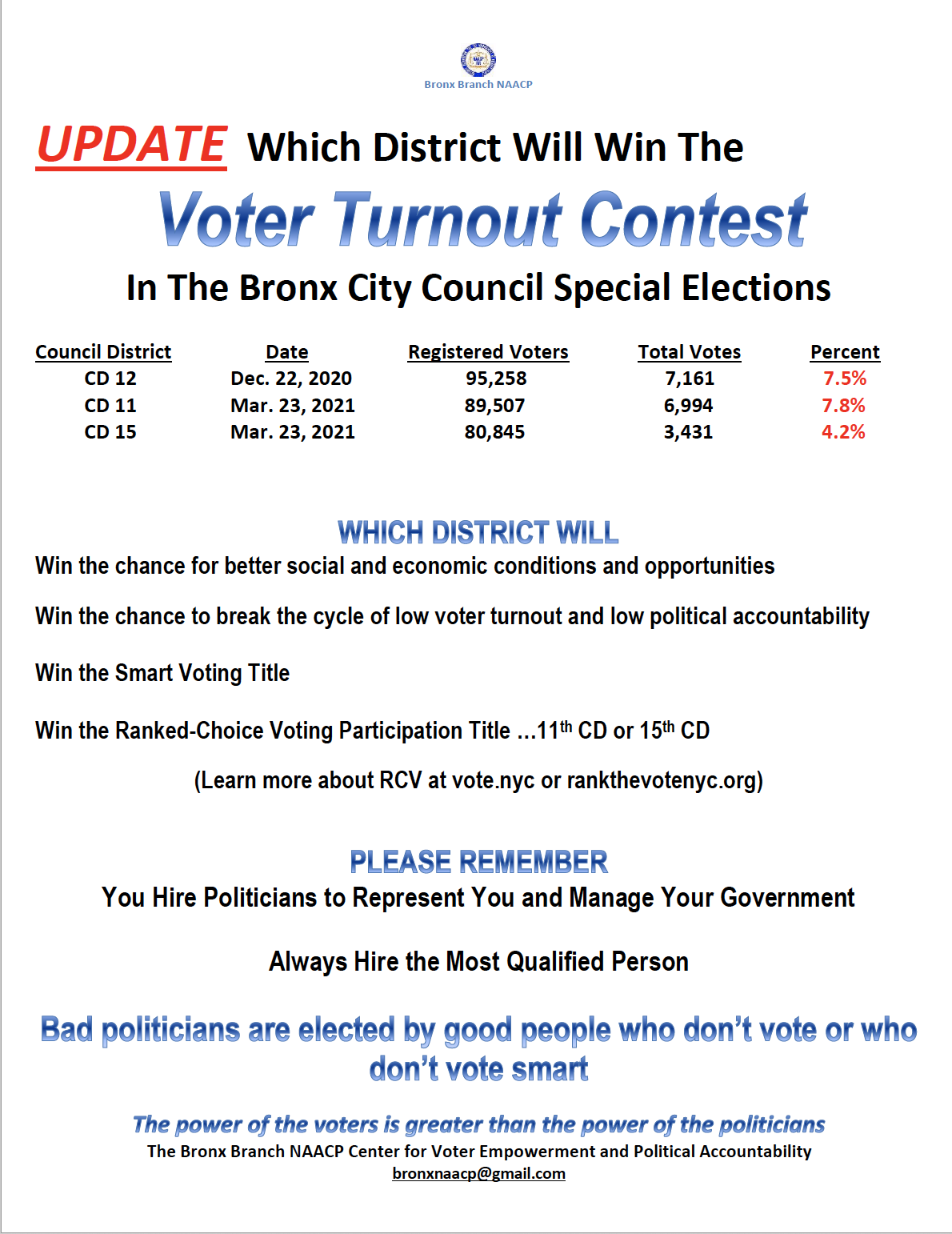 - The Norwood News held a “voter turnout contest” among districts in the Bronx City Council special election.